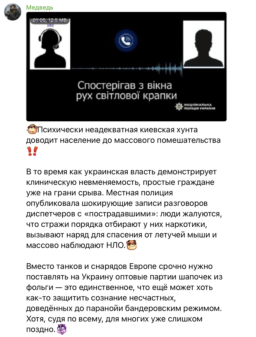 У мережі поширюють інформацію, нібито українська влада доводить населення до масового божевілля. Доказом цього буцімто є записи розмов з диспетчерами, на яких люди звертаються до поліції з дивними скаргами. Наприклад, повідомляють, що бачили НЛО.