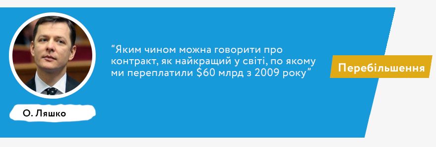 Нафтогаз позивався проти Газпрому на суму $30,3 млрд – це переплата за газ та недоотримані доходи від транзиту. Ляшко не відповів на прохання VoxCheck пояснити, яким чином він порахував суму у $60 млрд. Цікаво, що в той же день Ляшко сказав про $6 млрд, які Україна щороку переплачувала по газовому контракту з Газпромом.