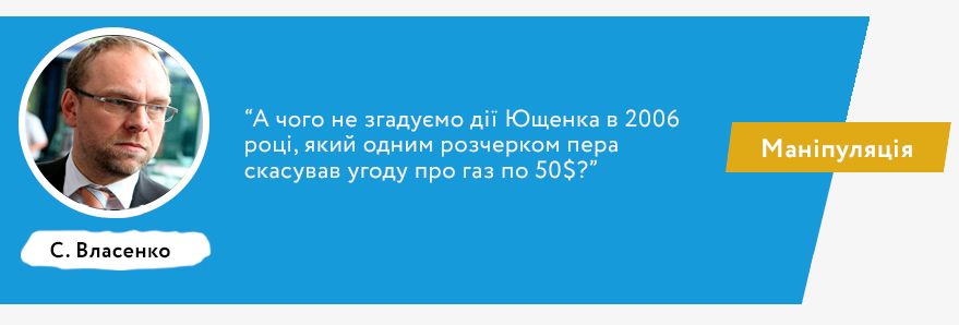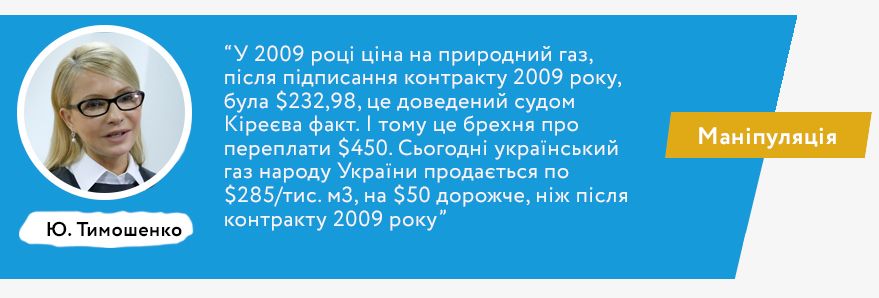 Згідно з договором з «Газпромом», базова ціна газу для України складала $450 за тис. куб. м, а фактична ціна на кожен квартал визначалася за спеціальною формулою, яка опосередковано враховувала ціну нафти. За вироком судді Кіреєва, у 2009 році російський газ Україні коштував $232 за тис куб.м, а в 2010 – $256 за тис куб. м. Фактична ціна була вища за $450 у 2014 році – $485, і це був наслідок контракту від 2009 року.