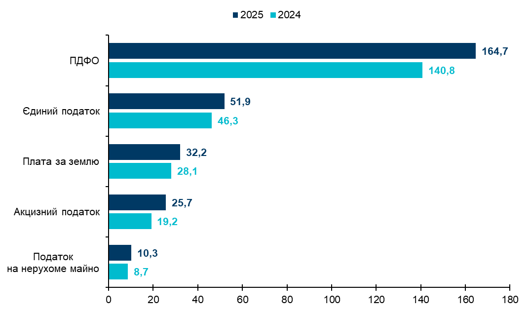 Рисунок 5. Надходження за основними податками до загального фонду місцевих бюджетів у 2025 та 2024 років, млрд грн