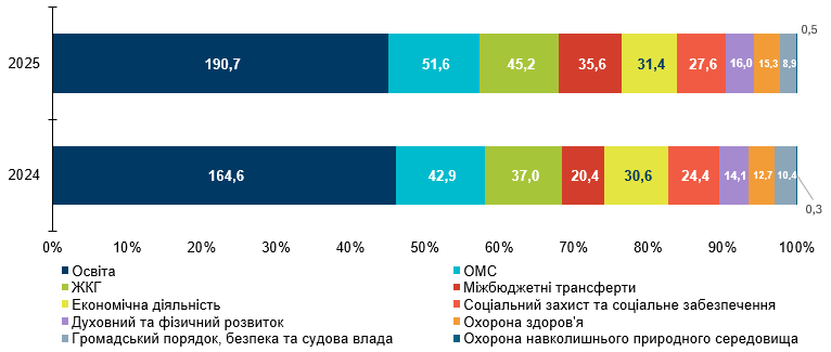 • У загальній структурі місцевих бюджетів поточні видатки становлять 85,4% або 360,73 млрд грн (+18,6% до відповідного періоду 2024 року). Капітальні видатки займають 14,6%. Фактично місцеві бюджети за десять місяців року профінансували 61,85 млрд грн капвидатків (на 16,6% більше, ніж торік).