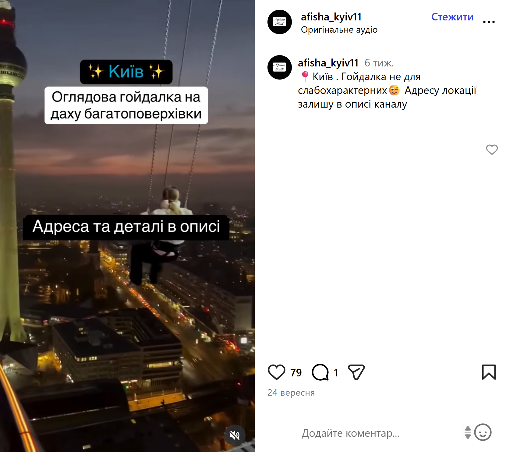 У мережі поширюють інформацію, буцімто у Києві на даху однієї з багатоповерхівок відкрили гойдалку. Як «доказ» додають відео та пропонують перейти за посиланням, щоб дізнатися точну локацію.