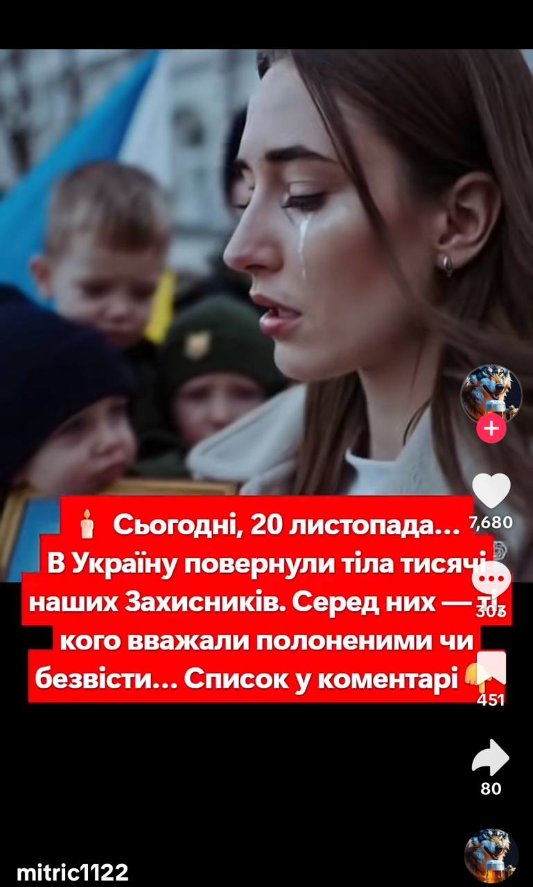 У мережі поширюють відео, в якому повідомляють, що 20 листопада 2025 року в Україну повернули тіла тисячі українських військових. Зокрема тих, кого вважали полоненими та зниклими безвісти. У коментарях також додають список полонених.