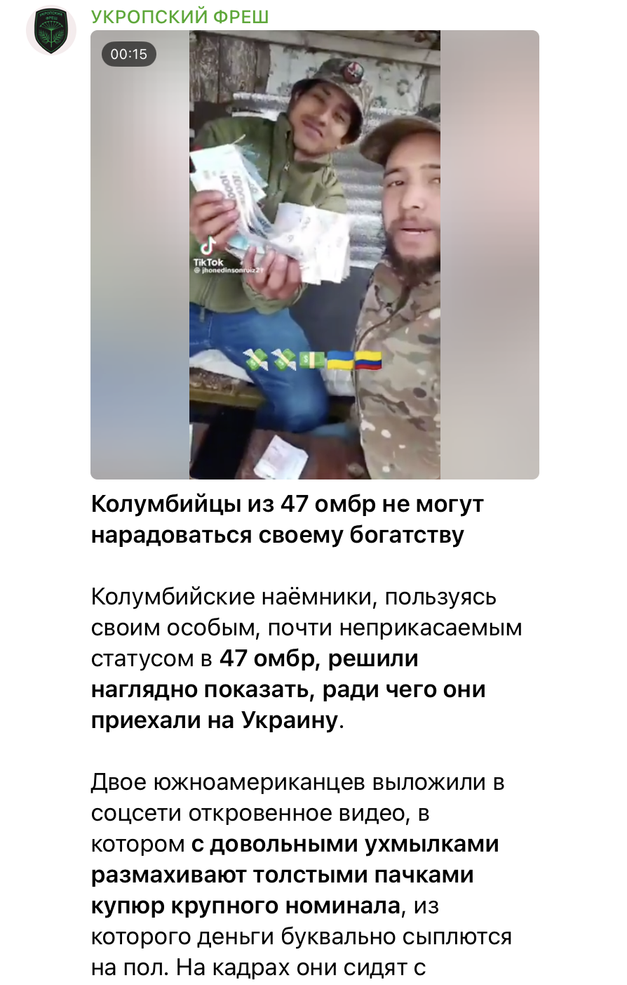 У соцмережах поширюють відео, у якому нібито іноземні добровольці з 47 окремої механізованої бригади демонстративно розмахують великими пачками грошей у доларах і радіють прибутку від служби в Україні. У дописі йдеться, що це начебто колумбійські найманці й що вони мають «особливий статус» у бригаді.