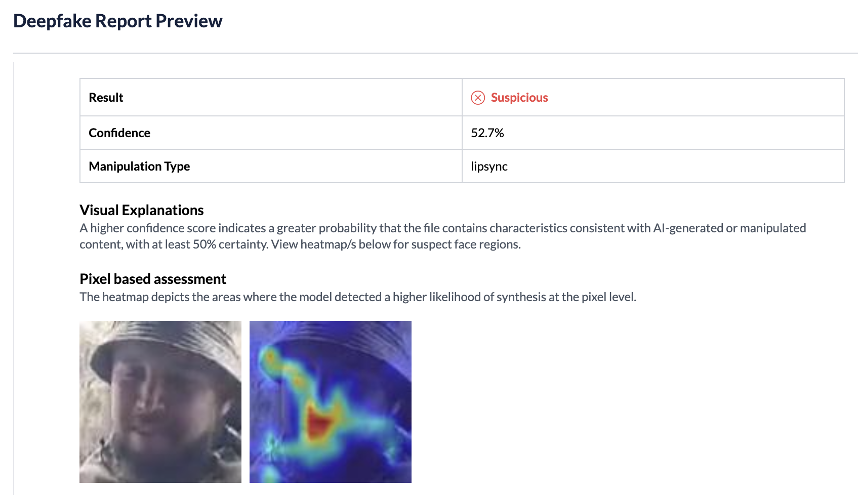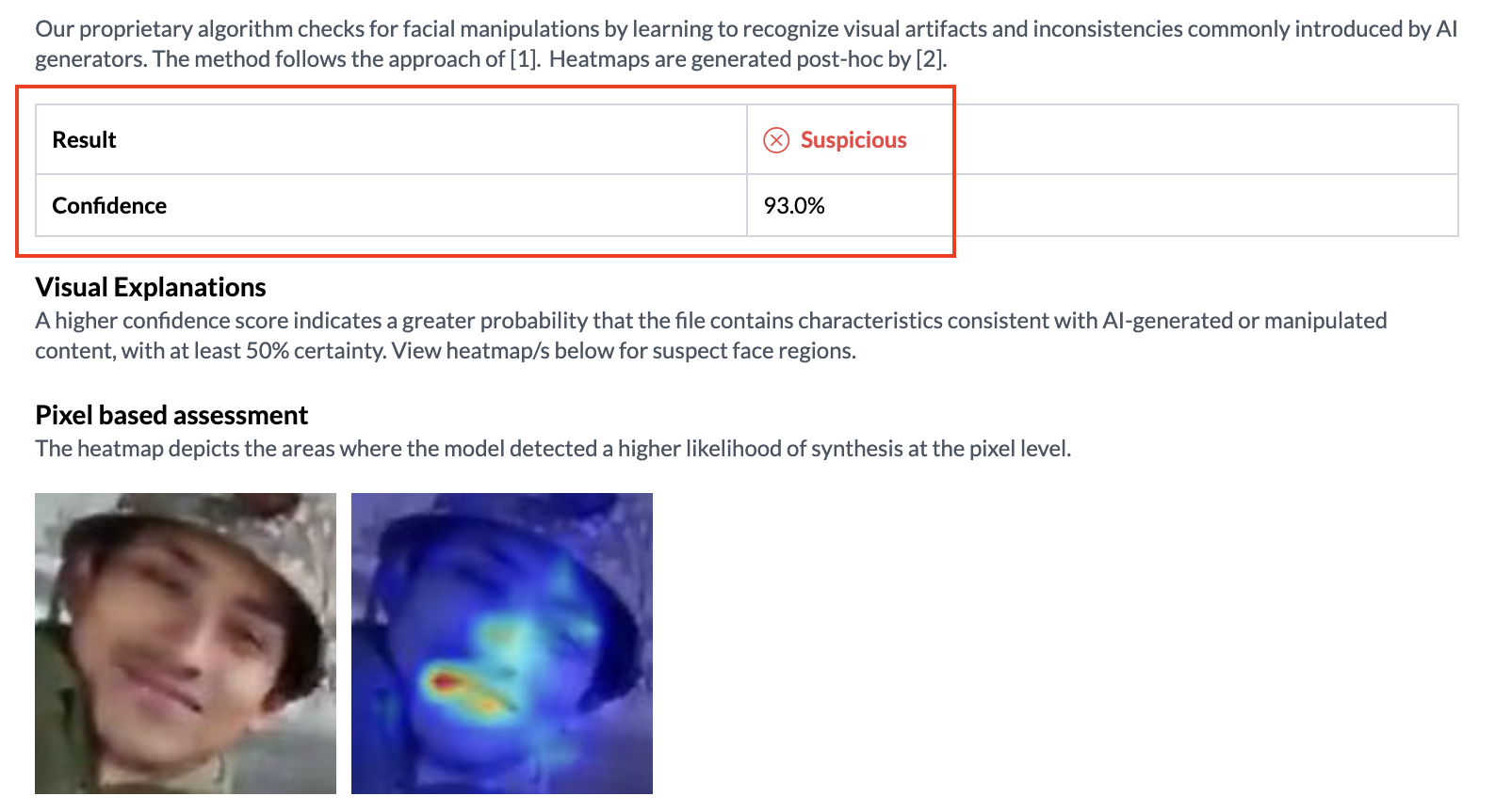 Перевірка в інструменті Sensity.AI, який виявляє ШІ-контент, показала, що з імовірністю 93% у відео використали face manipulation — обличчя чоловіків замінили або підробили за допомогою штучного інтелекту.