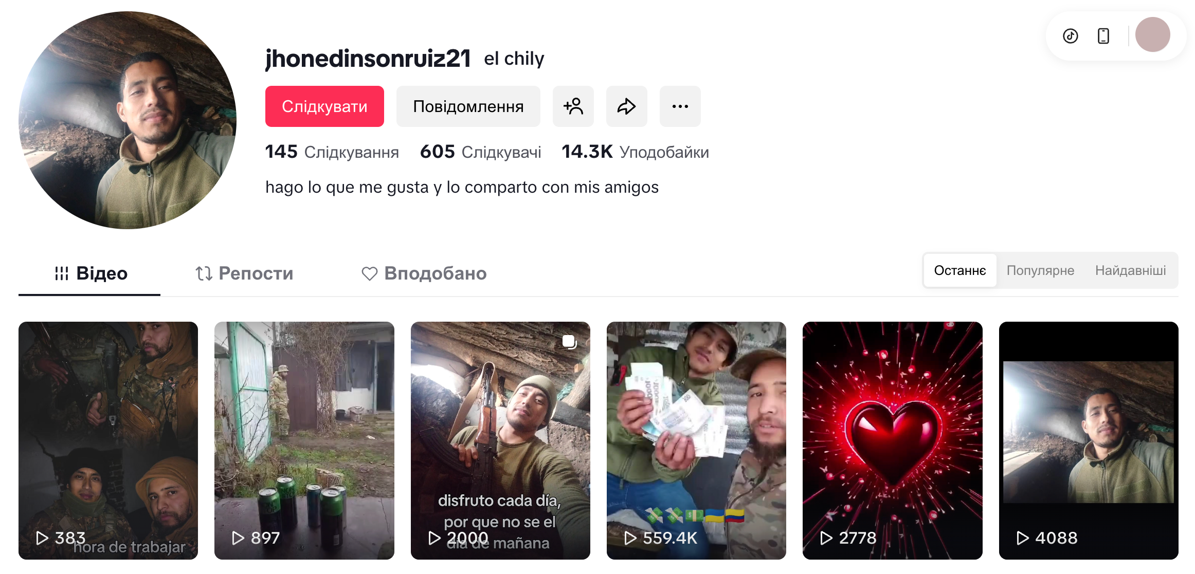 Першоджерело відео — тікток-акаунт @jhonedinsonruiz21, який справді виглядає як профіль іноземного добровольця.