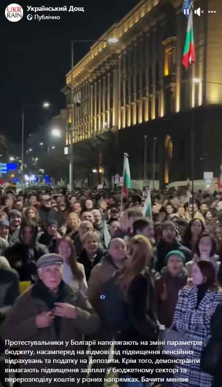 З 26 листопада у Софії, столиці Болгарії, справді почалися протести через ухвалення держбюджету на 2026 рік. Мітингувальники були обурені підвищенням податків, зокрема подвоєнням податку на дивіденди та збільшенням внесків на соціальне забезпечення. Пізніше протестувальники почали вимагати відставки уряду, чесних виборів та судової реформи для боротьби з корупцією.