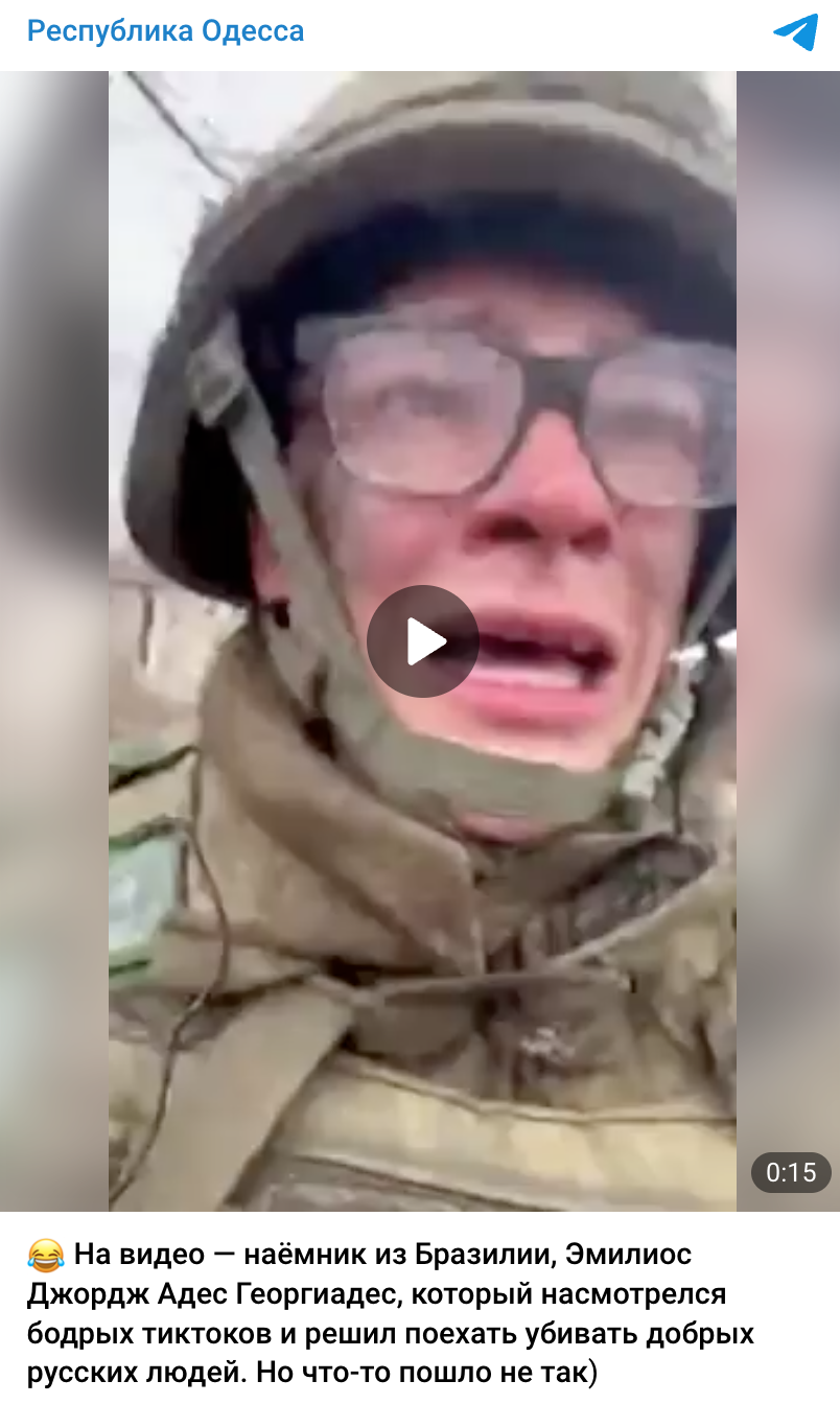 Російські телеграм-канали поширюють відео нібито бразильського добровольця, який приїхав в Україну воювати проти росії. У ролику він панікує і каже, що жалкує про своє рішення, бо «думав, що все буде інакше, як у кіно».