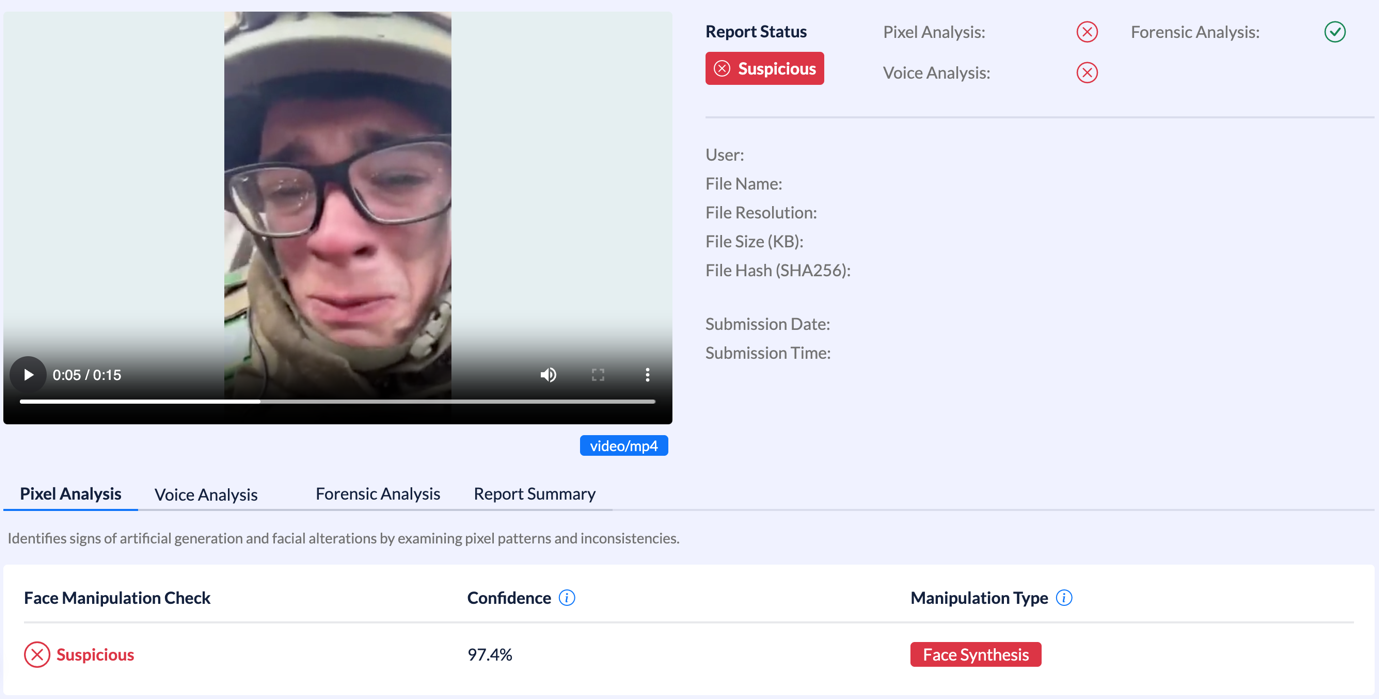 За допомогою інструменту з розпізнавання дипфейків Sensity AI ми зʼясували, що з імовірністю 97,4% це відео згенерували за допомогою ШІ. Для його створення використали технологію face synthesis, тобто обличчя людини на ролику штучно згенерували з нуля, а не на основі реального фото.