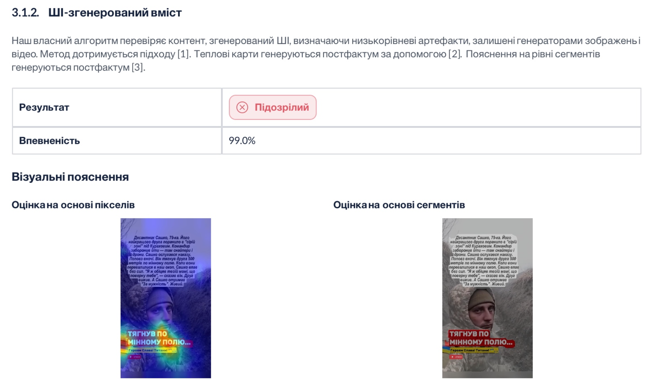 Перевірка в інструменті Sensity.AI показала, що з імовірністю 99% це відео створили за допомогою штучного інтелекту.