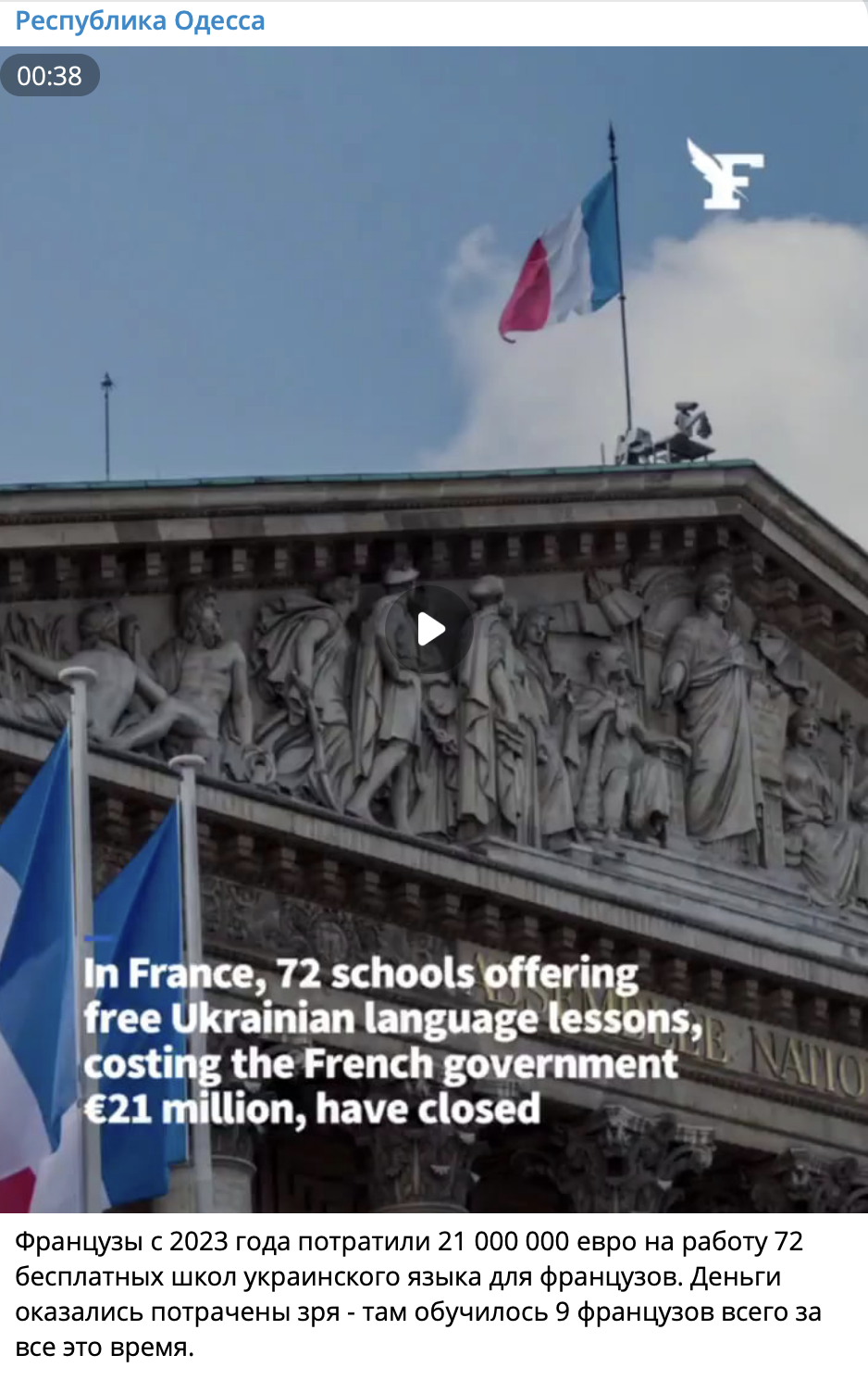 У мережі поширюють відео з логотипом видання Le Figaro, де йдеться про те, що нібито з початку 2023 року у Франції витратили понад €21 млн на створення шкіл української мови для французів. Мовляв, ці школи відвідали всього 9 людей за цей час.