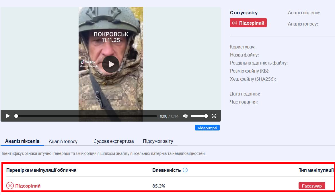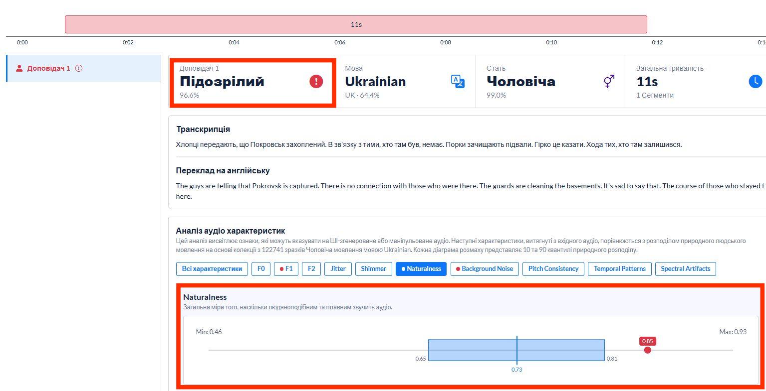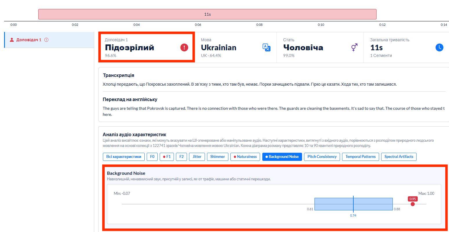 Крім цього, голос «військового» звучить роботизовано — рівно та без інтонації, що є ознакою синтетичного звуку. Перевірка в сервісі підтвердила, що з імовірністю 96,6% голос чоловіка та фонові звуки теж згенерували за допомогою ШІ.