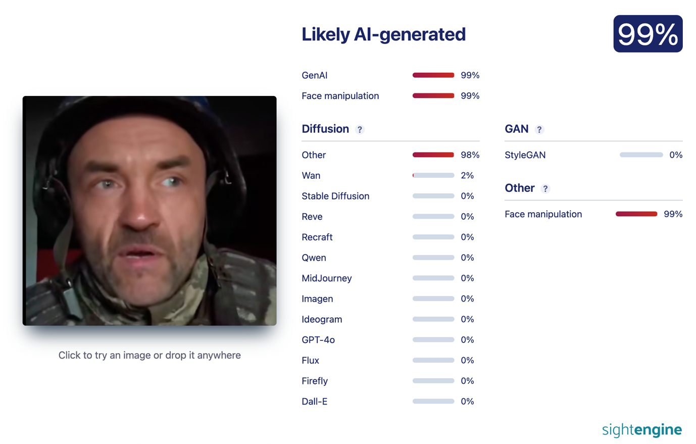 За допомогою перевірки в інструменті Sightengine ми зʼясували, що з імовірністю 99% відео згенерували за допомогою ШІ. Швидше за все, у відео підробили лише обличчя або його окремі частини, решта ж елементів (тулуб, каска, фон) справжні. Технологію підміни облич (face swap) часто використовують для створення дипфейків.