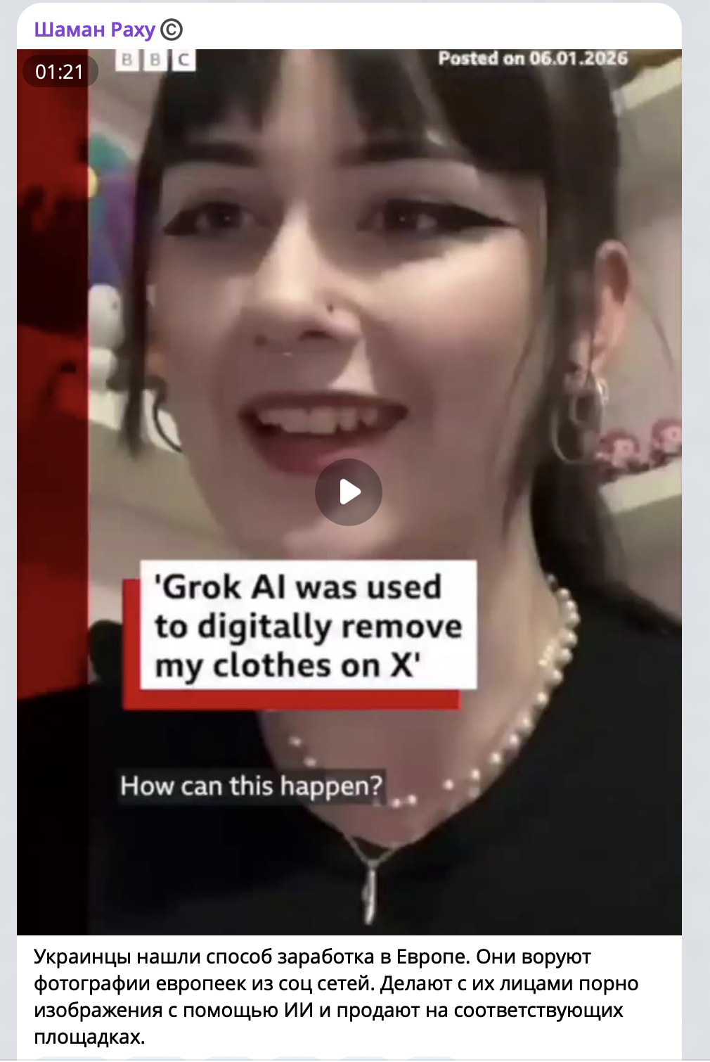Утім, це відеофейк. Відео BBC відредагували. У справжньому відео йдеться про проблему створення оголених фото за допомогою ШІ Grok. Українців у сюжеті не згадували.