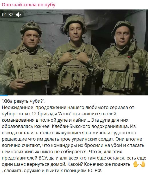 У мережі поширюють відеозвернення начебто бійців 12-ї бригади «Азов». У ньому військові звертаються до керівництва країни та бригади. Вони «проклинають» їх, звинувачують у великих втратах та оточені підрозділу армією рф.
