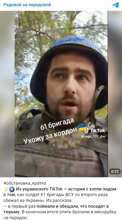 У мережі поширюють відео з нібито військовим 61 ОМБр, який розповідає, що вже вдруге намагається втекти з позицій за кордон. Він вказує, що перша спроба не вдалася, бо його спіймали і повернули на фронт.