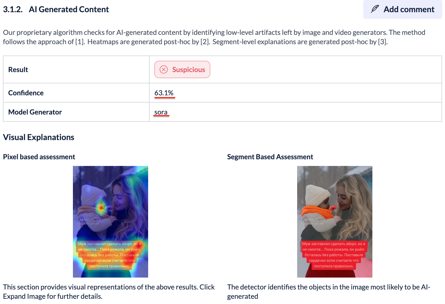 Перевірка за допомогою сервісу Sensity AI показала, що відео з імовірністю 63% створили за допомогою ШІ-моделі Sora.