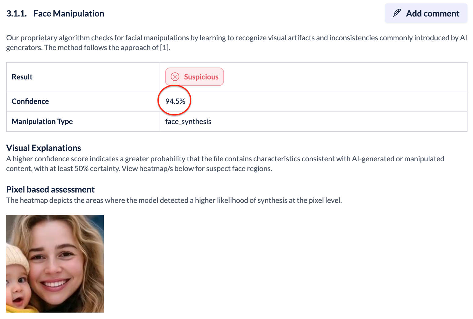 Також результати перевірки вказують на використання face synthesis — з імовірністю 94% обличчя жінки згенерували з нуля за допомогою нейромережі.