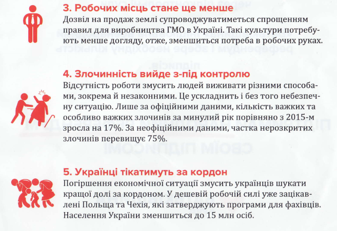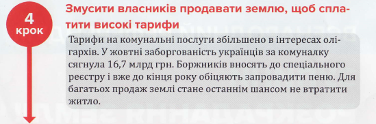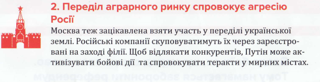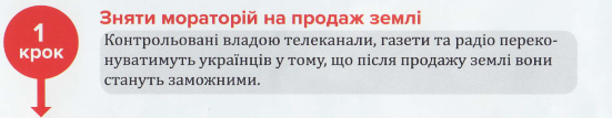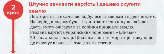 Спочатку брошура стверджує, що контрольовані владою телеканали, радіо та газети будуть переконувати українців у тому, що після продажу землі вони стануть заможними.