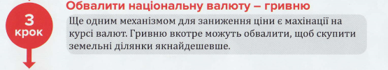 З 2015 року НБУ є незалежним від президента та Кабміну, тому примусити Нацбанк обвалити гривню буде важко. Більш того, як і на нерухомість, ціни на землю в Україні часто встановлюються в доларах (зокрема і у цій брошурі), тому навіть припустивши, що є план «обвалу гривні», зовсім не гарантовано, що він призведе до зниження доларової ціни на землю.