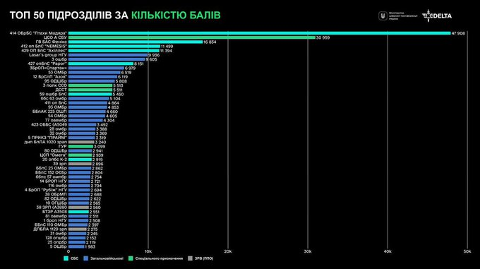 Рейтинґ балів провідних підрозділів БПЛА України за вересень 2025 року демонструє суттєвий розрив між лідерами та рештою.